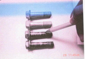 Apparently 2 bolts (see picture above - click for large view) worth about 50 to 100 Baht on the front suspension had been milled, possibly/likely during the last season, so that the car could get more camber on the front wheels. Arto-TRD is saying that they did not check this, because the camber of the car was not over normal standards when they were asked to check it. Consequently they did not think they had to check this.