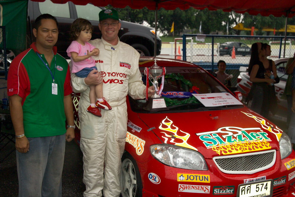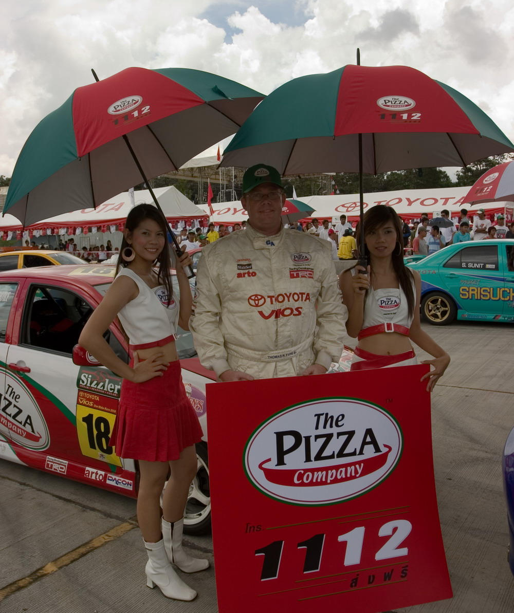 Thomas was very happy, and the commentator, was talking about that this had to be the Fastest Pizza delivery service in Thailand (Thomas car is covered in stickers from his main Sponsor “The Pizza Company”).
