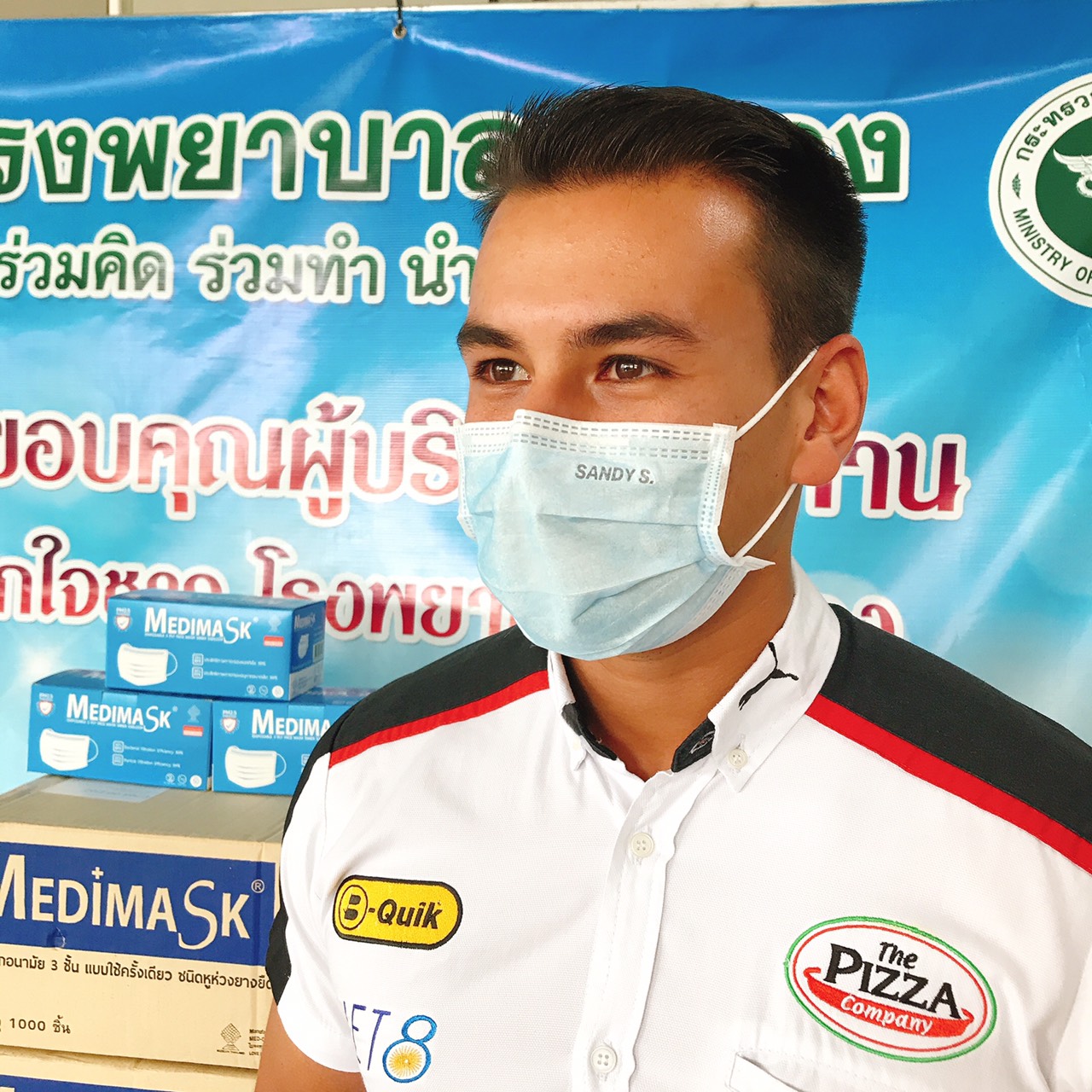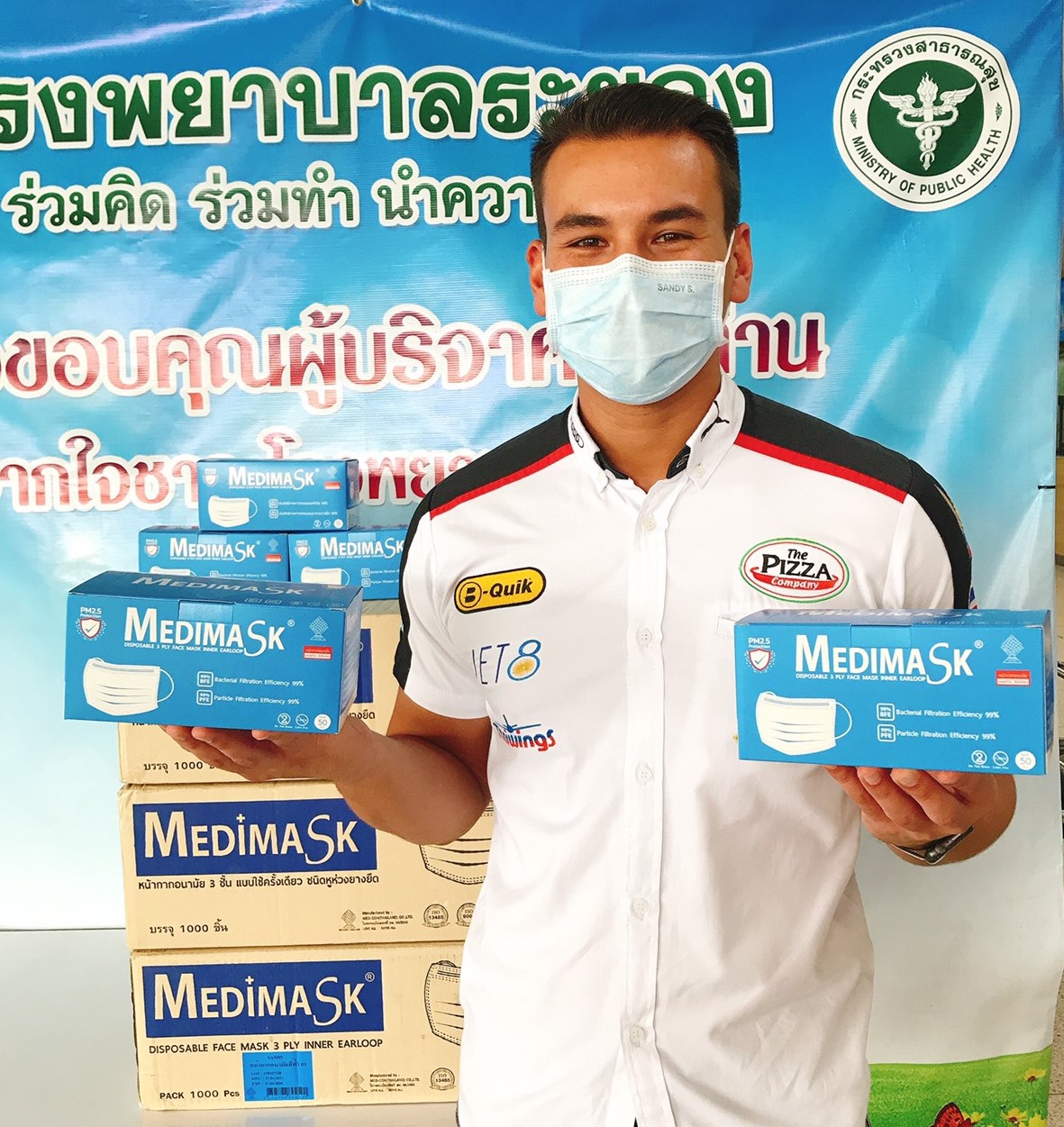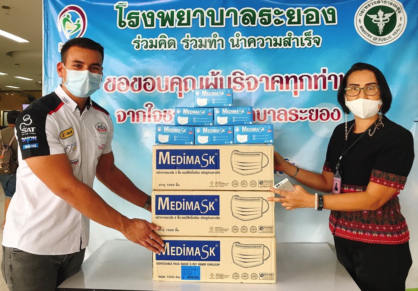 Sandy Kraokaew Stuvik, professional Thai racing driver and reigning Thai GT3 Champion who lives in the Rayong province has ordered 3,000 disposable medical face masks from Medimask, specially embossed with “Sandy S.”, to donate to the brave medical teams that are on the front lines of the Covid-19 pandemic. Sandy would like to be another source of encouragement for the medical teams at the Rayong hospitals. Today, Khun Suda Srilaong, Financial and Accounting of Rayong hospital was the representative to receive the masks.