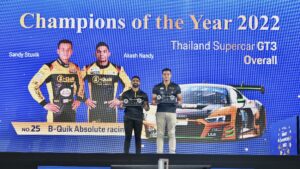 Sandy Kraokaew Stuvik collected his Champion’s Trophy after finishing first in the GT3 overall class in the Thailand Super Series 2022. Sandy shared his #25 Audi R8 GT3 Evo II with Akash Nandy, and the pair produced a fantastic drive in the final round to clinch the championship.